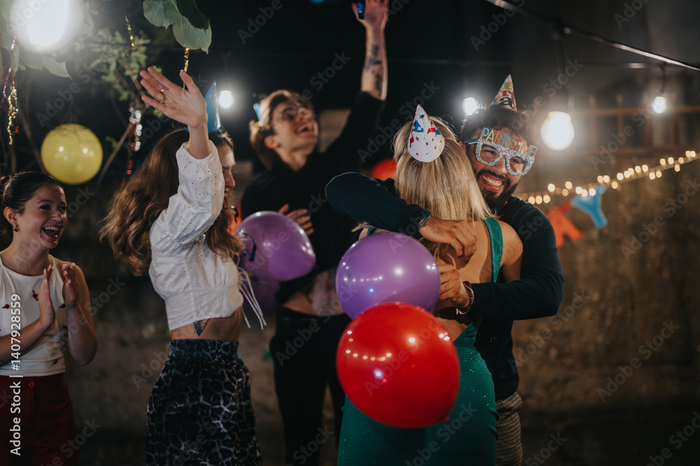 A joyful group of friends celebrating a birthday outdoors, filled with decorations, balloons, and cheerful party hats. The festive atmosphere embodies fun, laughter, and togetherness as they enjoy a