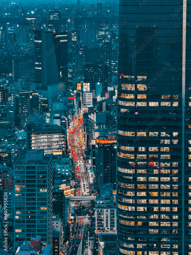Minato, Tokyo, Japan - Night view of Azabudai Hills and illuminated city streets seen from Tokyo Tower