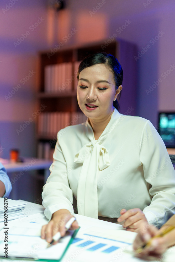 Businesswoman pointing at charts during a late night meeting with colleagues at the office