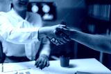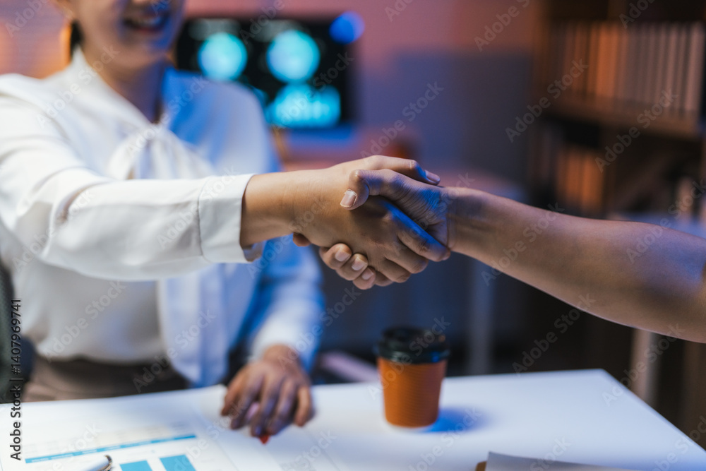 Two businesswomen shaking hands after reaching an important business agreement during a late night meeting in the office