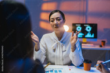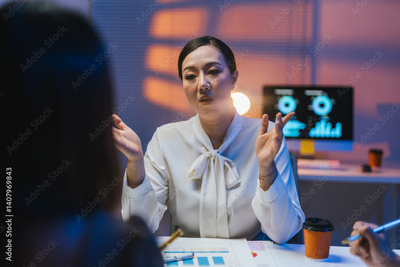 Asian business manager explaining marketing strategy during an evening meeting with colleagues in the office