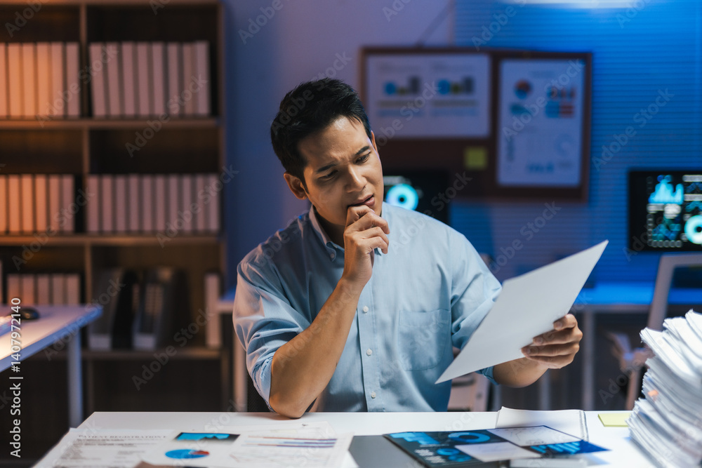 Asian businessman reviewing documents and thinking with hand on chin while working late at night in office with computer and graphs showing