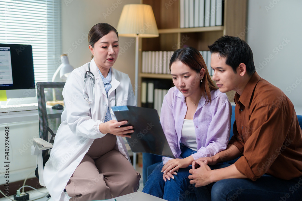 Female doctor showing radiography to a worried couple during medical consultation in hospital office