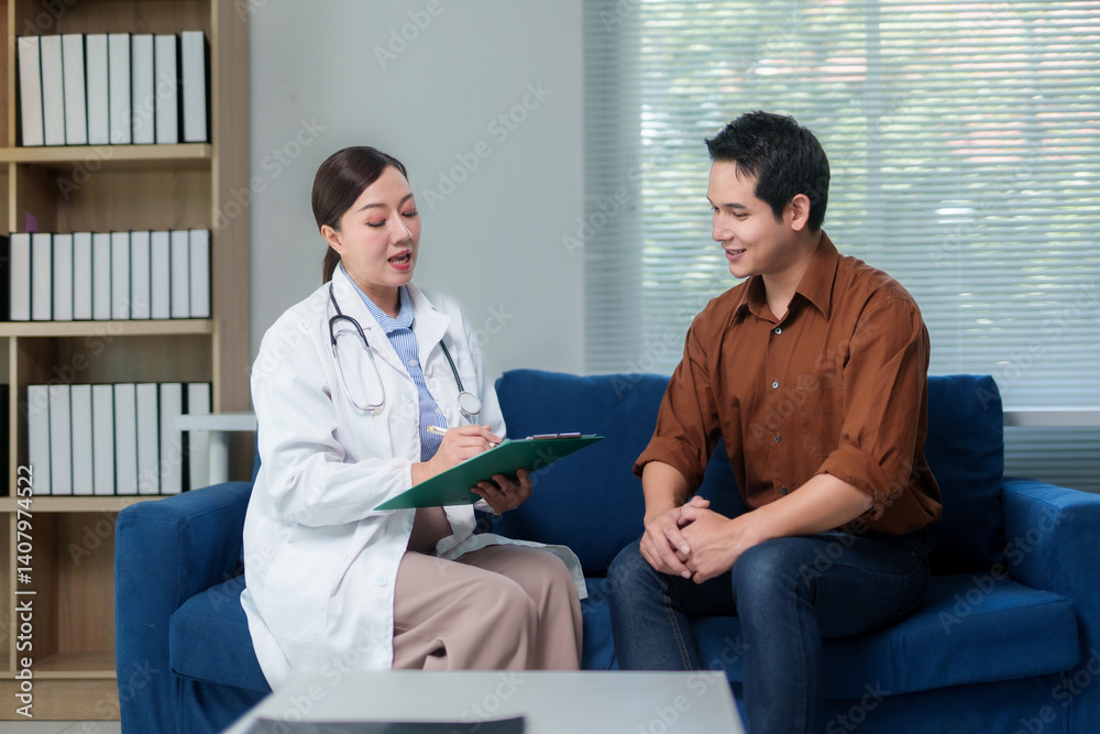 Doctor and patient sitting on a sofa during medical consultation in hospital office, healthcare and medical concept