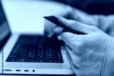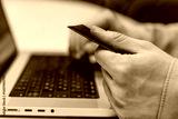 A man holds a bank card while sitting at a laptop, the concept of online shopping