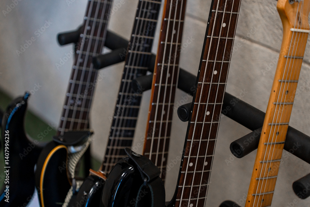 There are different electric guitars in the recording studio. Saint Petersburg, Russia - 6 Apr 2025