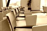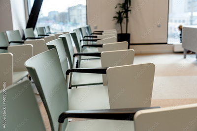 Chairs in the auditorium for students, rows with chairs for listening to reports and speeches, no people