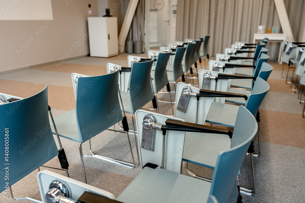 Chairs in the auditorium for students, rows with chairs for listening to reports and speeches, no people