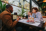 A diverse team of people engage in a business discussion, showcasing teamwork and collaboration in a vibrant and inclusive environment filled with greenery in a modern coffeehouse.