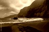 Beautiful Seixal Port Beach in Madeira features stunning black sand and dramatic cliffs under a cloudy sky