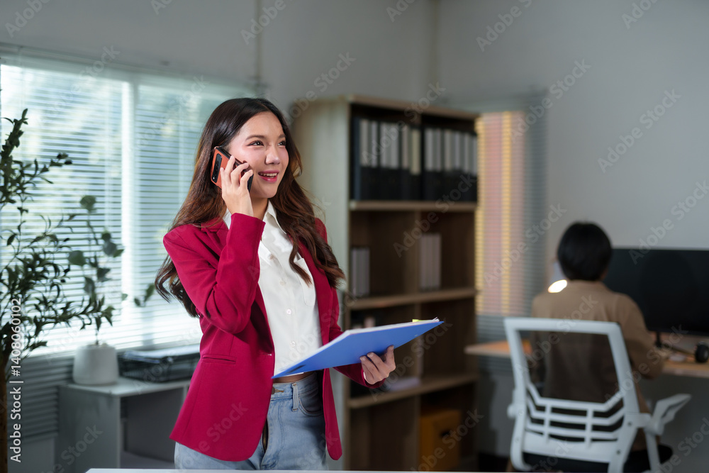 Asian businesswoman talking on a mobile phone while holding a folder, standing confidently in a modern office environment
