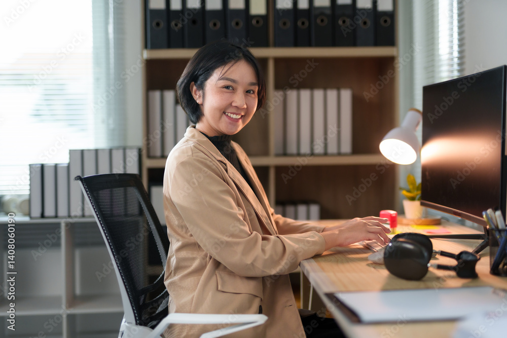 Asian female manager smiling and typing on keyboard, sitting at desk with desktop pc in contemporary workplace