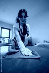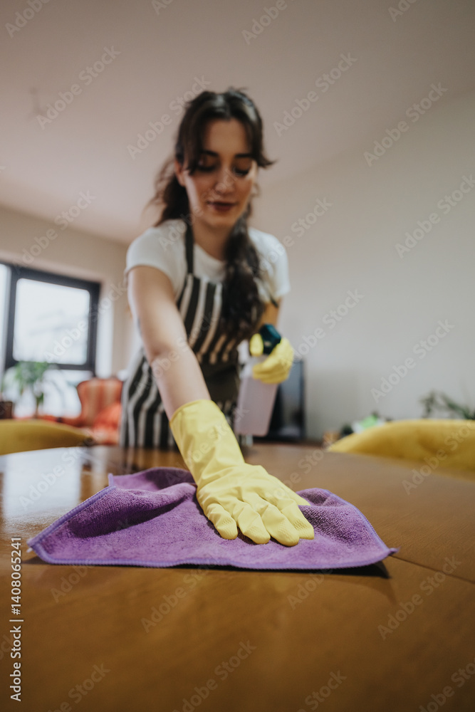Focused woman dusting a wooden table with a purple cleaning cloth, protected by yellow gloves, in a bright household setting.