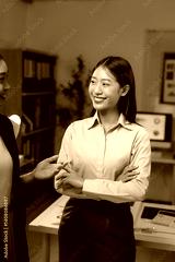 Two asian businesswomen talking and smiling in the office at night, discussing work and projects
