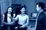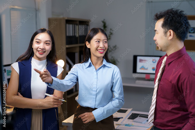 Asian businesspeople discussing and working together using computer and digital tablet for presentation at night in office