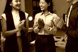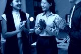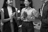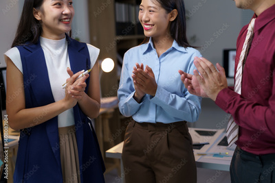 Asian businesspeople clapping hands and celebrating achievements during a nighttime meeting in the office, radiating positivity and teamwork