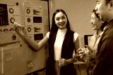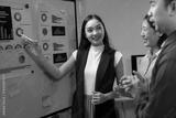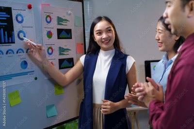 Young businesswoman pointing at charts on whiteboard and explaining marketing strategy to colleagues during a presentation in office meeting room