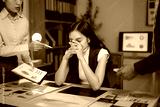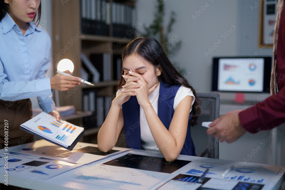Asian businesspeople working late at night, feeling overwhelmed and stressed as they review troubling financial reports and facing tight deadlines