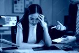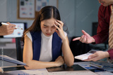 Young businesswoman having headache and receiving negative feedback at office desk, colleagues pointing out mistakes and business failure concept