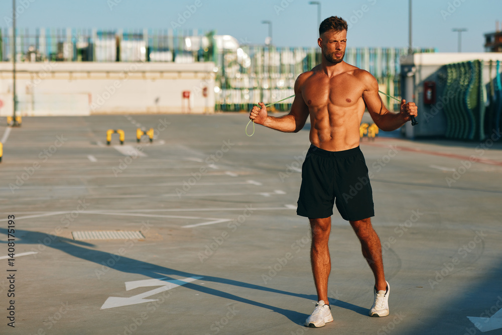 Muscular athlete pausing jump rope workout on urban rooftop parking lot