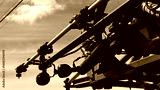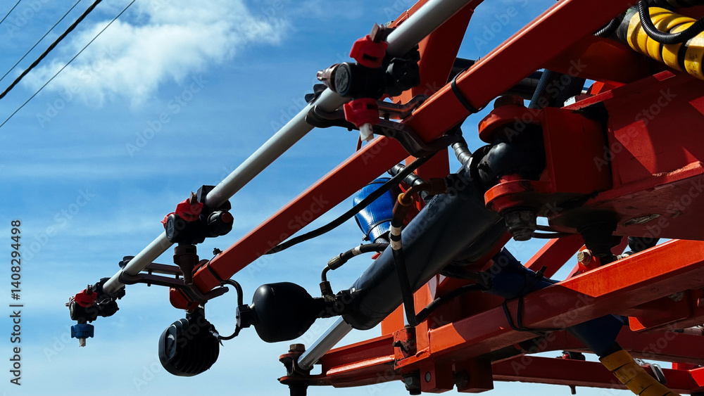 Spraying system close-up on a modern agricultural sprayer, with visible fertilizer nozzles and piping.
