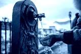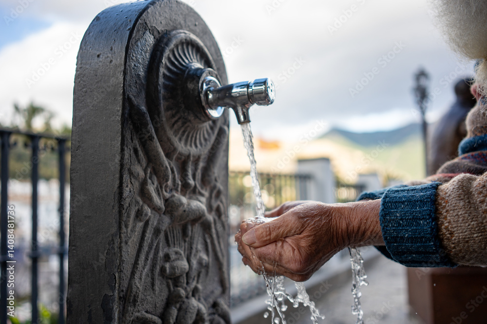Close-up of an elderly man's hands catching fresh water from an ornate stone fountain in a mountain village, symbolizing refreshment, nature, and a simple moment of connection with the outdoors.