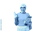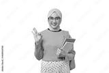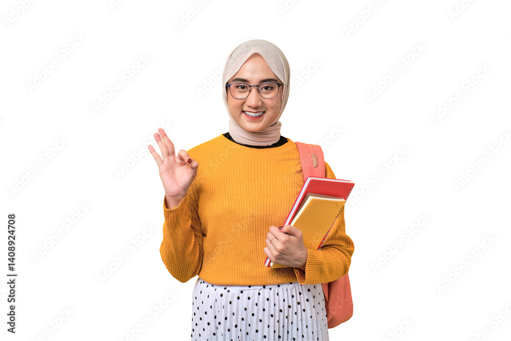 Smiling young Asian student girl with backpack holding notebook, doing ok sign with finger isolated on transparent background