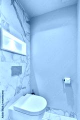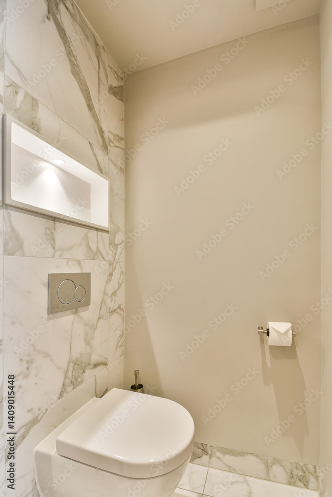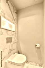 A sleek and minimalist bathroom featuring marble walls, contemporary fixtures, and a stylish toilet design. Perfect for modern home aesthetics.