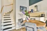 A stylish modern interior featuring a gracefully curved staircase, a round dining table, contemporary chairs, and a vibrant floral centerpiece enhancing the space.