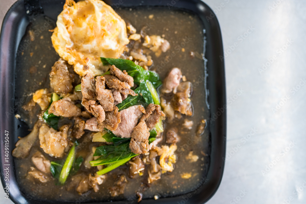 Fried noodle with pork and Kale in gravy sauce served together with egg