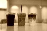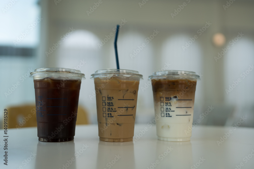 Three take away iced coffee drinks sitting on a cafe table, iced americano, iced mocha and iced latte.