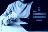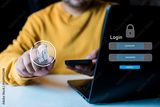Man hand use fingerprints touch to login and password, cyber security concept, data protection and secured internet access. Cyber security data protection information privacy internet technology.