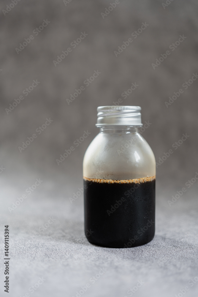 Black coffee in plastic bottle with lid silver. Close up