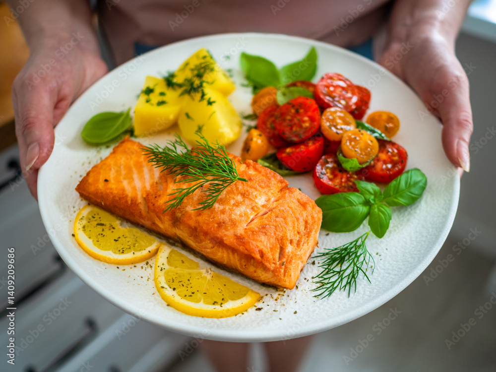 Woman holding plate with seared salmon steak with cherry tomatoes and boiled potatoes