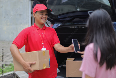 Delivery Asian Male Courier Showing Screen Of Smartphone While Delivering Packages