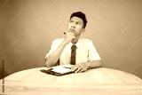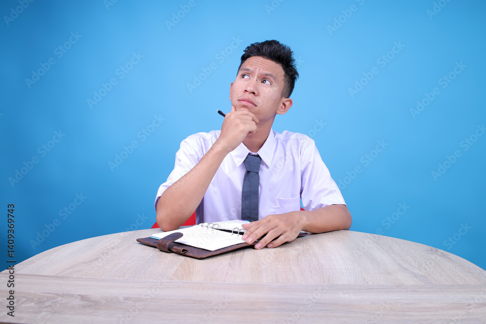 Thoughtful Indonesian High School Student Looking Aside While Studying with Books on The Table