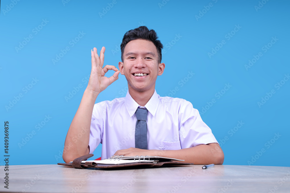 Young Student in Uniform Sitting at The Desk Showing Okay Sign Gesture While Doing Task in Notebook