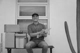 Excited Young Asian Delivery Man Posing With Writing On Clipboard And Sitting While Looking At Camera