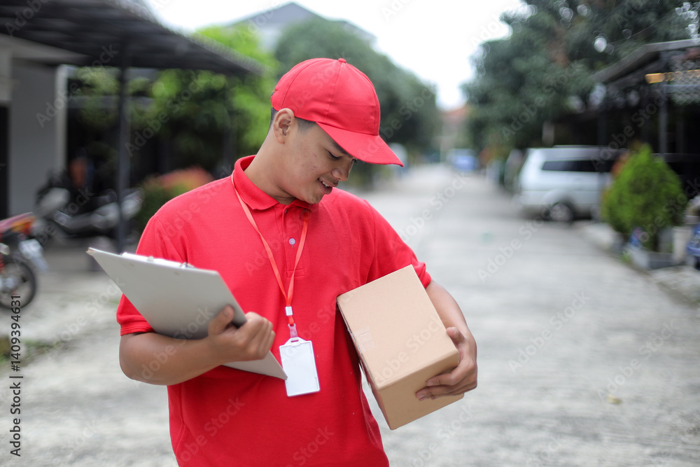 Excited Young Asian Courier Male In Red Uniform Delivering Packages While Holding Clipboard