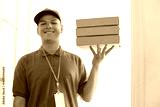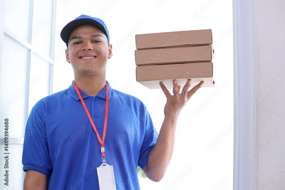 Happy Smiling Young Deliveryman Wear Blue Uniform Standing In The Front Door Holding Pizza Box