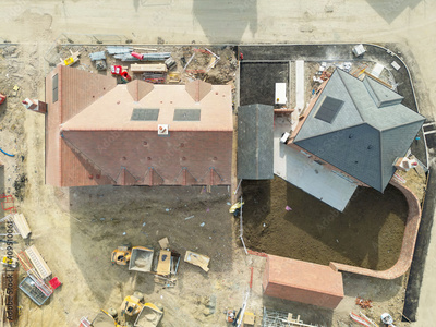 Drone top down view of near completed semi detached and a large corner plot, detached home in rural Britain. Topsoil has been laid to the larger house rear garden.