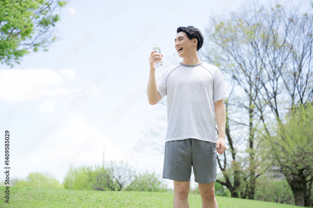 青空の中、ランニングのスポーツや運動で水分補給(水を飲む)する若い男性のクローズアップ