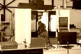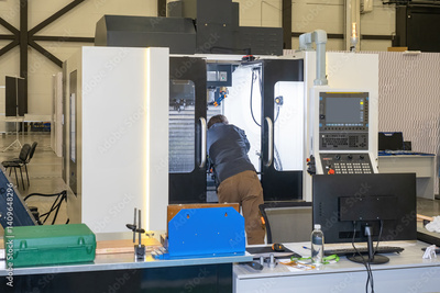 Modern workshop with CNC machine. Man near milling equipment. Table with computers inside production workshop. Worker looks inside CNC machine. Maintenance process of modern industrial equipment