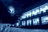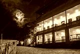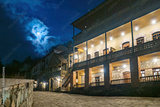 Resorts Armenia. Dilijan region. Tourist houses in evening in Armenia. Ancient architecture Dilijan. Buildings from last century illuminated at night. Path paved with stones among houses in Armenia