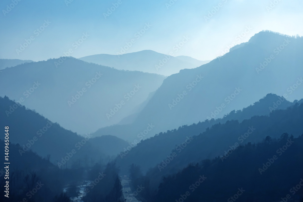 Mountains Armenia. Nature Transcaucasia. Landscape with hilly terrain. Mountain gorge with river and road. Armenian highlands. Western Asia. Panorama Armenia. Nature of Transcaucasia view from drone
