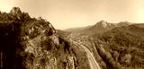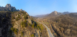 Mountains Armenia. Road at foot of cliffs. Tavush region. Mountains in Transcaucasus. Route from city Dilijan. Panorama Armenia as seen from drone. Mountain nature. Rocky landscape. Trees on rocks