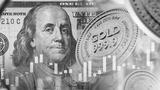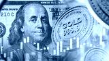 Investment coins. Trading with pure gold. Price growth chart for precious metals. Buying gold fragment of dollar money. Investment coins with financial quotes. Buying collectible gold coins
