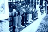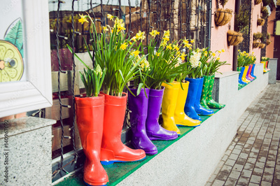 Yellow daffodils and hyacinth in multicolored rubber boots used as pots decorating the storefront window. Selective focus