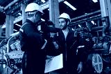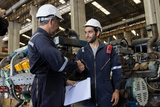 Engineer train engine service team working together at train depot locomotive industry Electric train technician engineer checking controls system for security functions in maintenance infrastructure