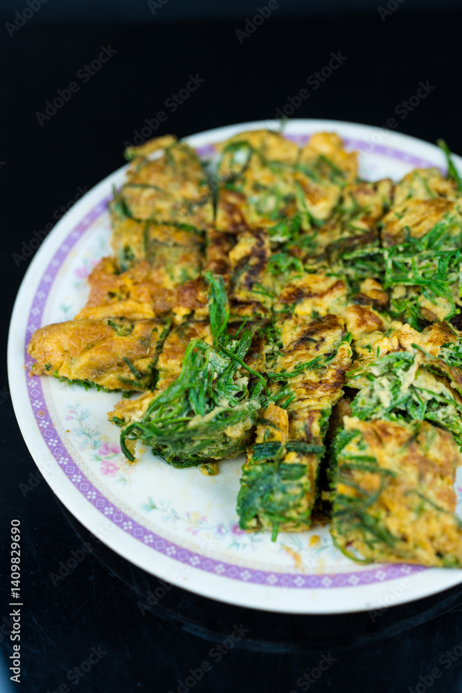 Fried egg with climbing wattle plant, Thai called Cha Om Kai